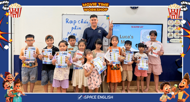 Cuối tuần vừa qua, ISPACE ENGLISH đã tổ chức thành công workshop “Rạp chiếu phim mini & học tiếng Anh qua phim hoạt hình” dành cho các bé từ 5–10 tuổi. Chương trình hoàn toàn miễn phí, mang đến một không gian học tập cực kỳ mới lạ, kết hợp giải trí và giáo dục. Với ánh mắt chăm chú, tiếng cười giòn tan cùng những chia sẻ dễ thương bằng tiếng Anh, các bạn nhỏ đã có một buổi sáng đáng nhớ khi cùng nhau thưởng thức bộ phim Disney nổi tiếng “Mùa hè của Luca” trong không khí “chuẩn rạp cine”.